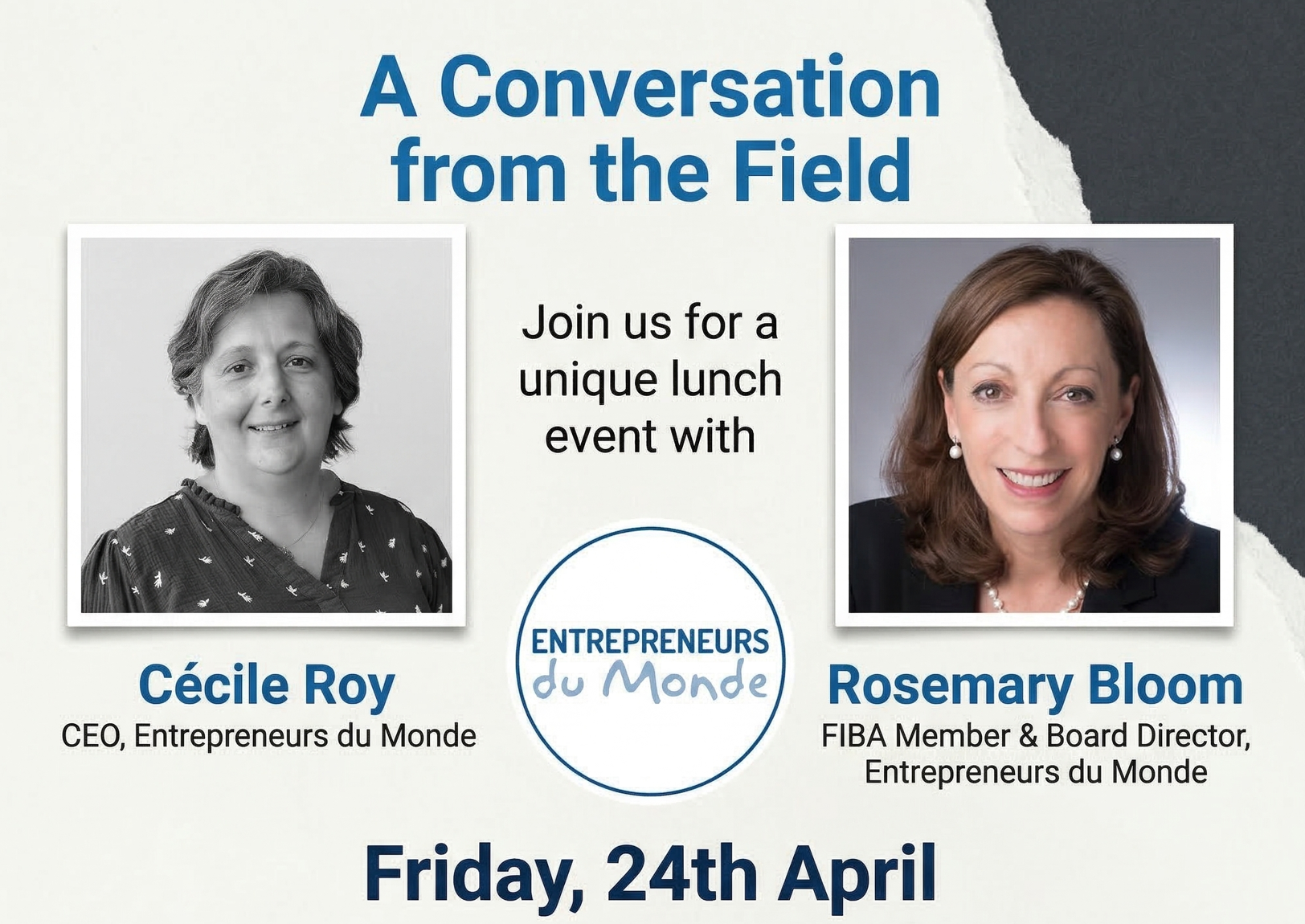 During our lunch, Cécile and Rosemary will take us behind the scenes. They’ll share real stories from the field, break down how their economic model creates lasting change, and offer a frank look at the challenges and rewards of working on the front lines of global entrepreneurship.